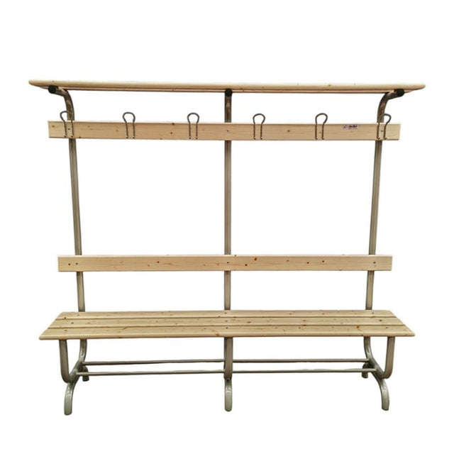 Panca spogliatoio modello Classico con schienale, poggia borse, porta scarpe e appendiabiti integrati.