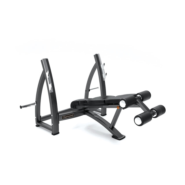 La Panca Olimpica Declinata della serie 750 DIAMOND dispone di 2 supporti bilanciere ad altezze diversificate oltre alla comodità di avere 2 supporti dischi per lo stoccaggio immediato.