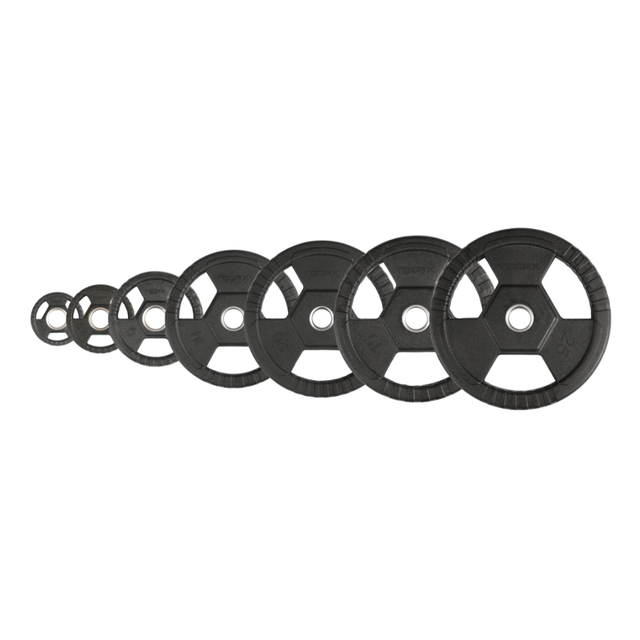Il design trigrip con maniglie integrate facilita la movimentazione del disco e rende più semplice il carico, lo scarico e l’utilizzo anche in esercizi a corpo libero. La boccola svasata in acciaio inox migliora ulteriormente l’inserimento sulla barra, rendendo il carico/scarico rapido e agevole. Compatibile con bilancieri olimpici grazie al foro centrale da 50 mm.