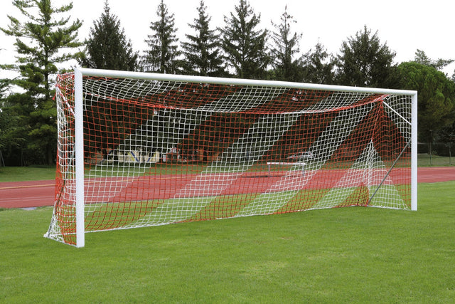 Porta da calcio regolamentare 7,32 × 2,44 m realizzata in lega di alluminio, conforme alla normativa europea UNI EN 748, progettata per garantire sicurezza, stabilità e praticità d’uso durante allenamenti e competizioni.